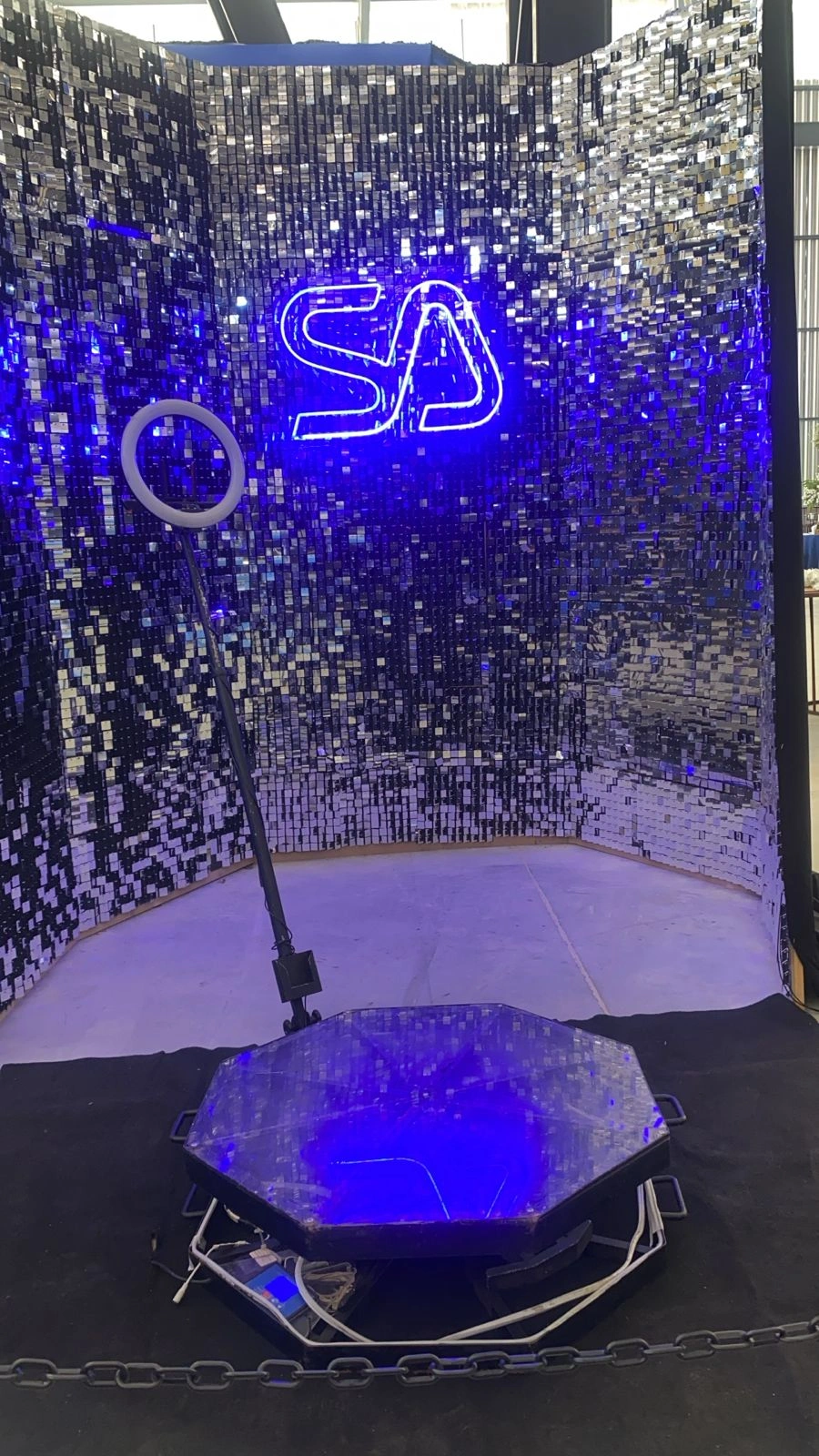 A cabine 360 é uma plataforma giratória que grava vídeos em alta qualidade com efeitos envolventes, ideal para tornar qualquer evento inesquecível.